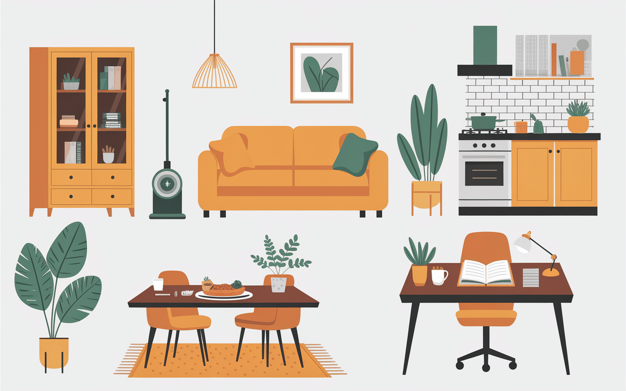 Dans le salon et les chambres, vous trouverez l’armoire pour ranger vos vêtements, l’aspirateur pour nettoyer vos sols, et l’ampoule qui éclaire vos soirées. N’oublions pas l’antenne de votre télévision, l’album photo de famille, ou encore l’aquarium si vous avez des poissons.